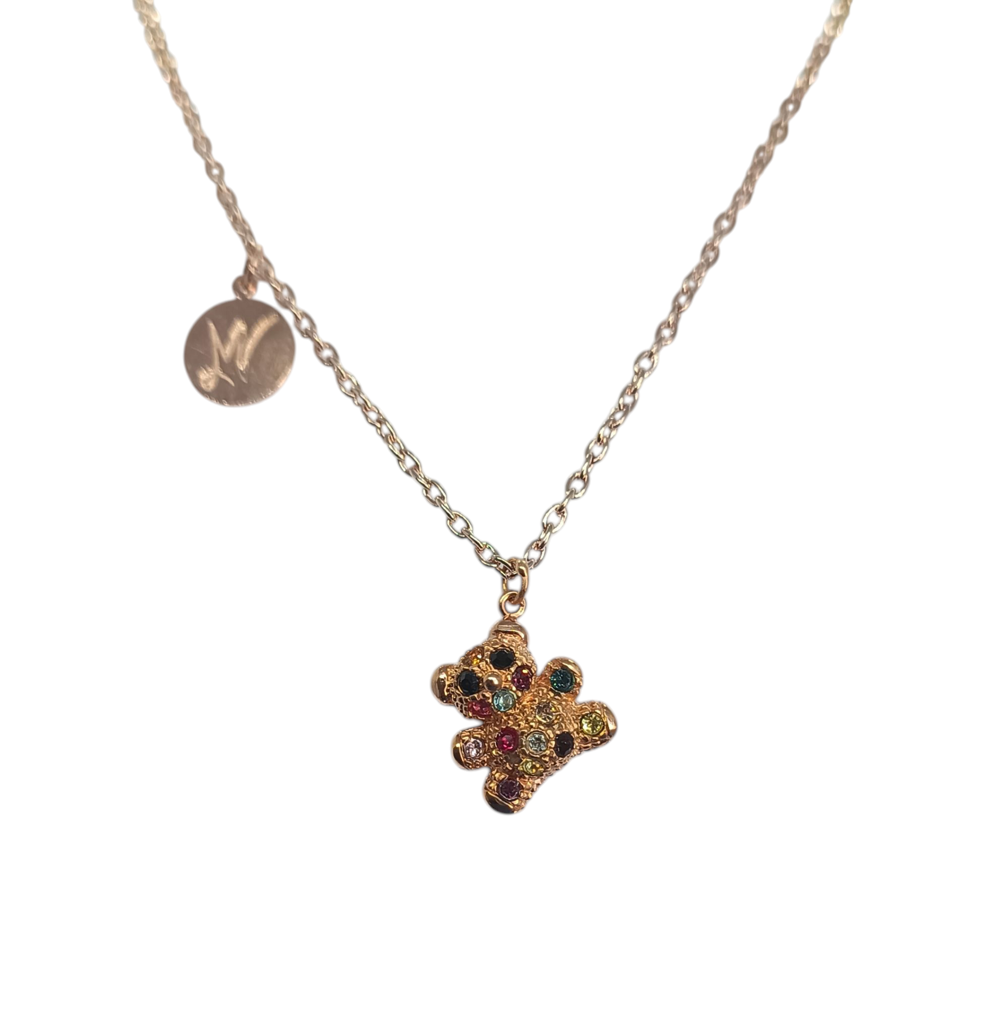 COLGANTE OSITO PELUCHE MULTICOLOR, LATÓN, BAÑO DE ORO ROSA, PIEDRAS SWAROVSKI.
