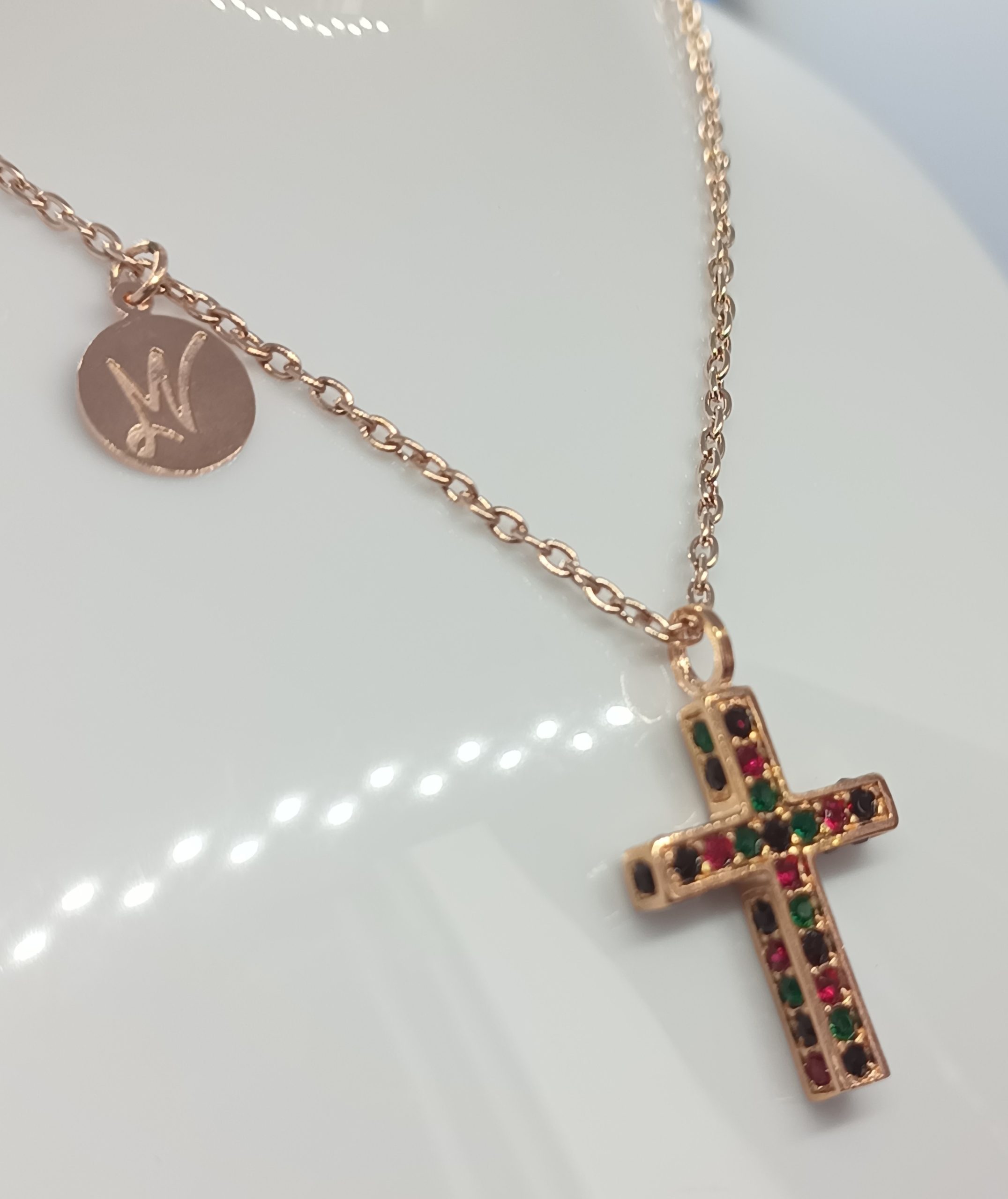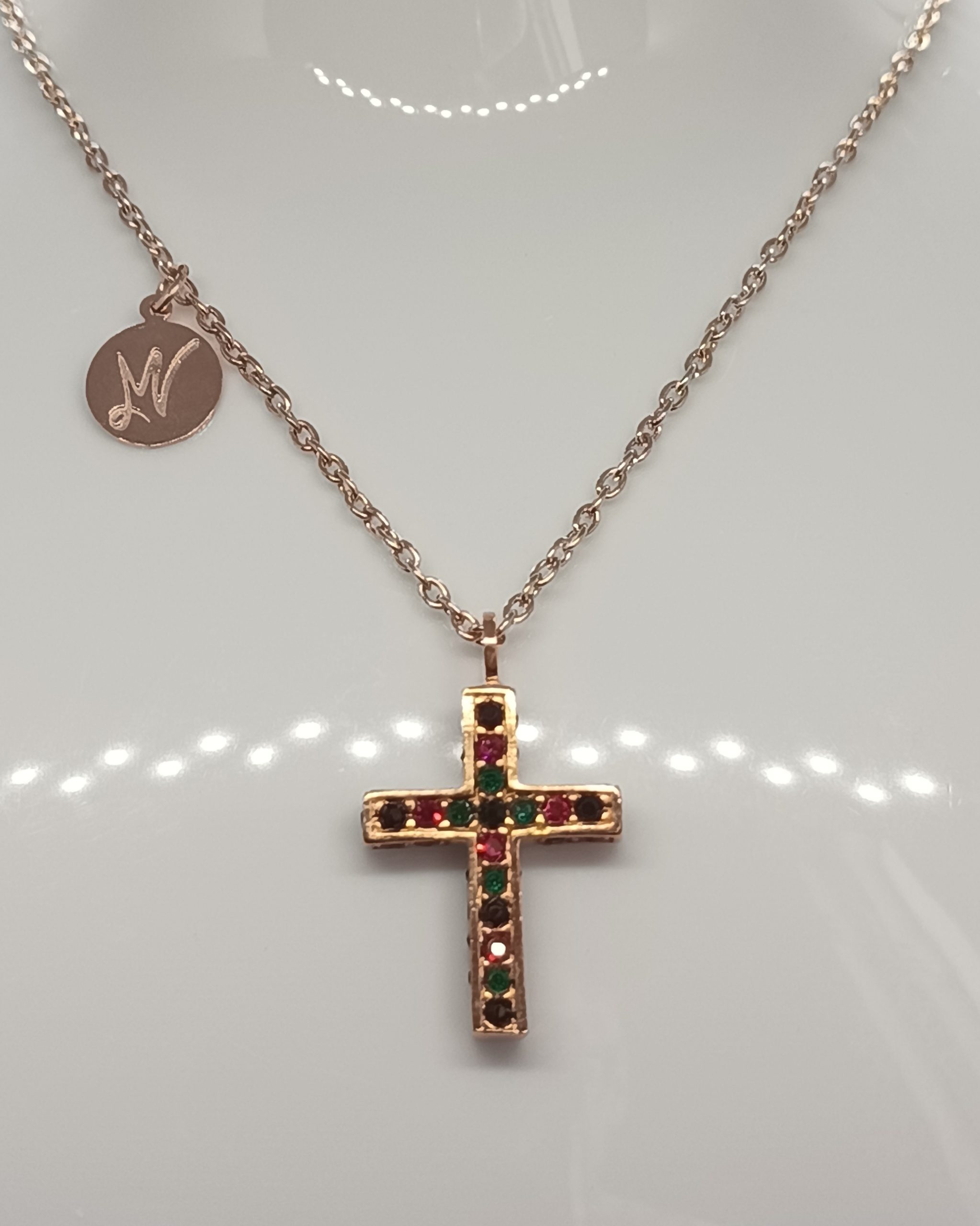 CRUZ MULTICOLOR, LATÓN CON BAÑO DE ORO ROSA, PIEDRAS CRISTAL SWAROSKI. (CON CADENA).