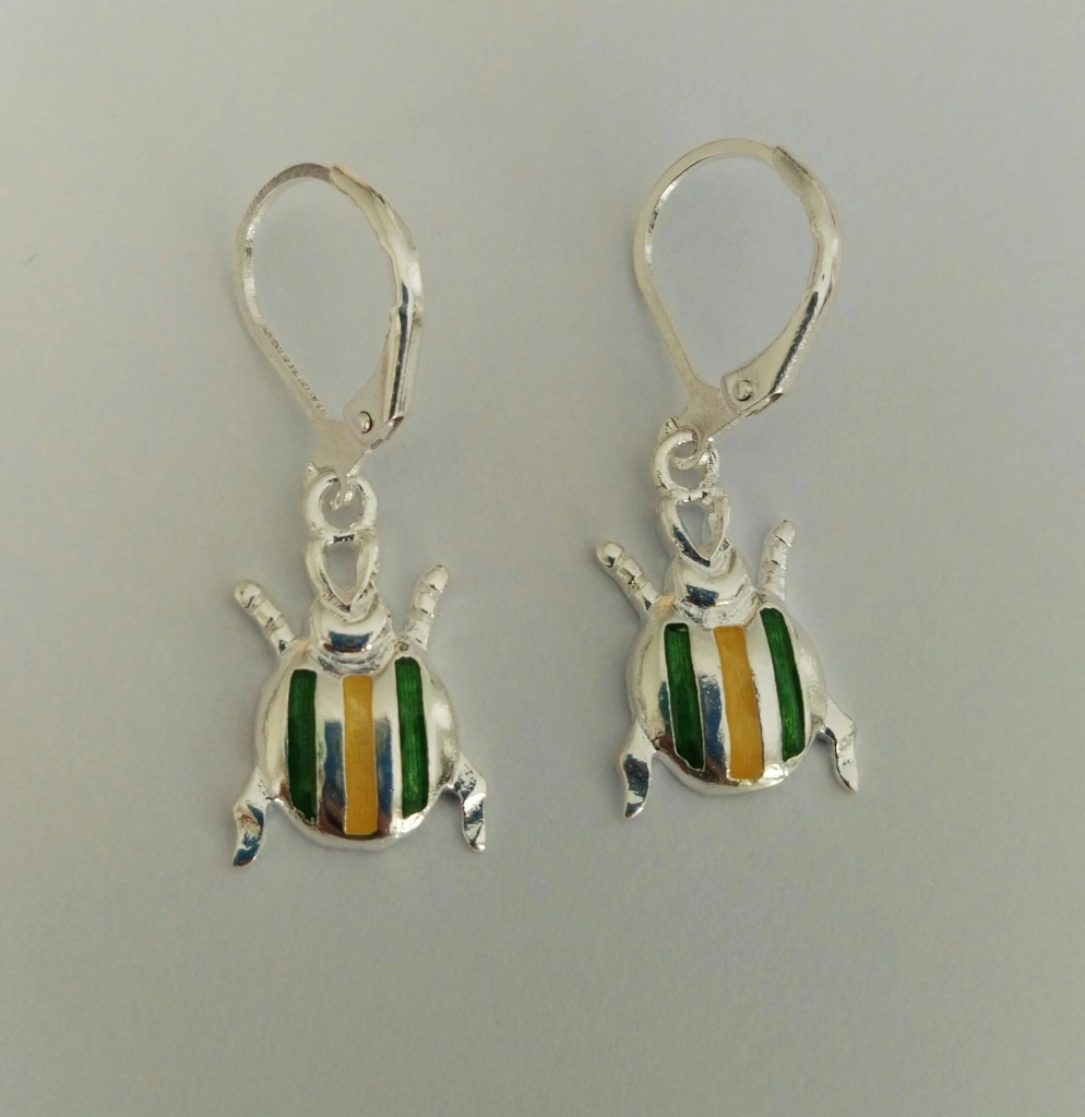 Pendientes escarabajo, de metal con baño de plata y esmalte.