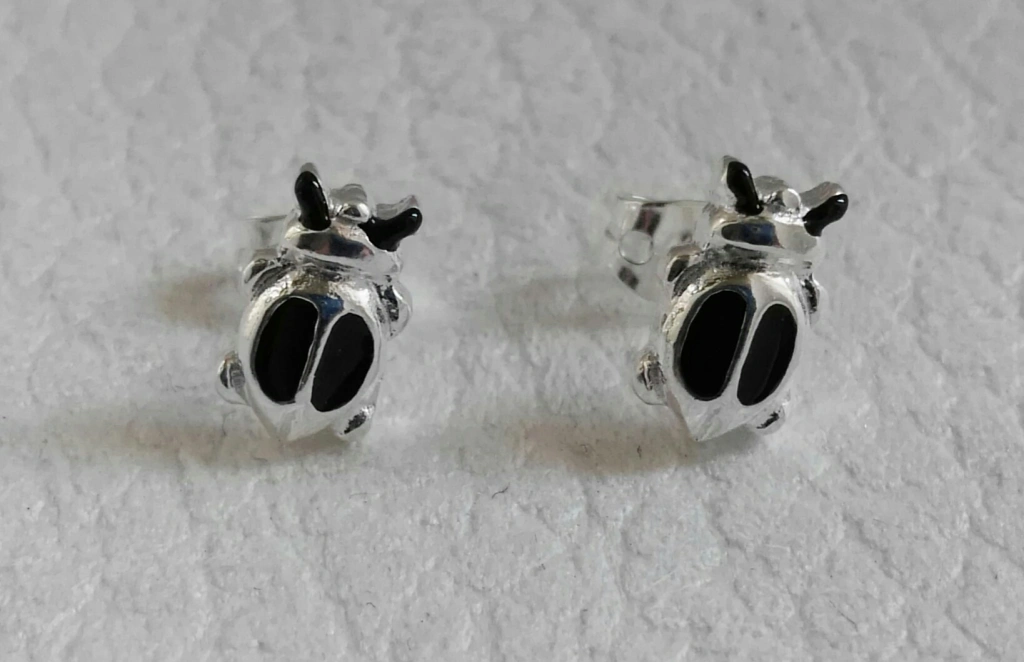 Pendientes de escarabajo de la suerte, en metal con baño de plata y esmaltados.
