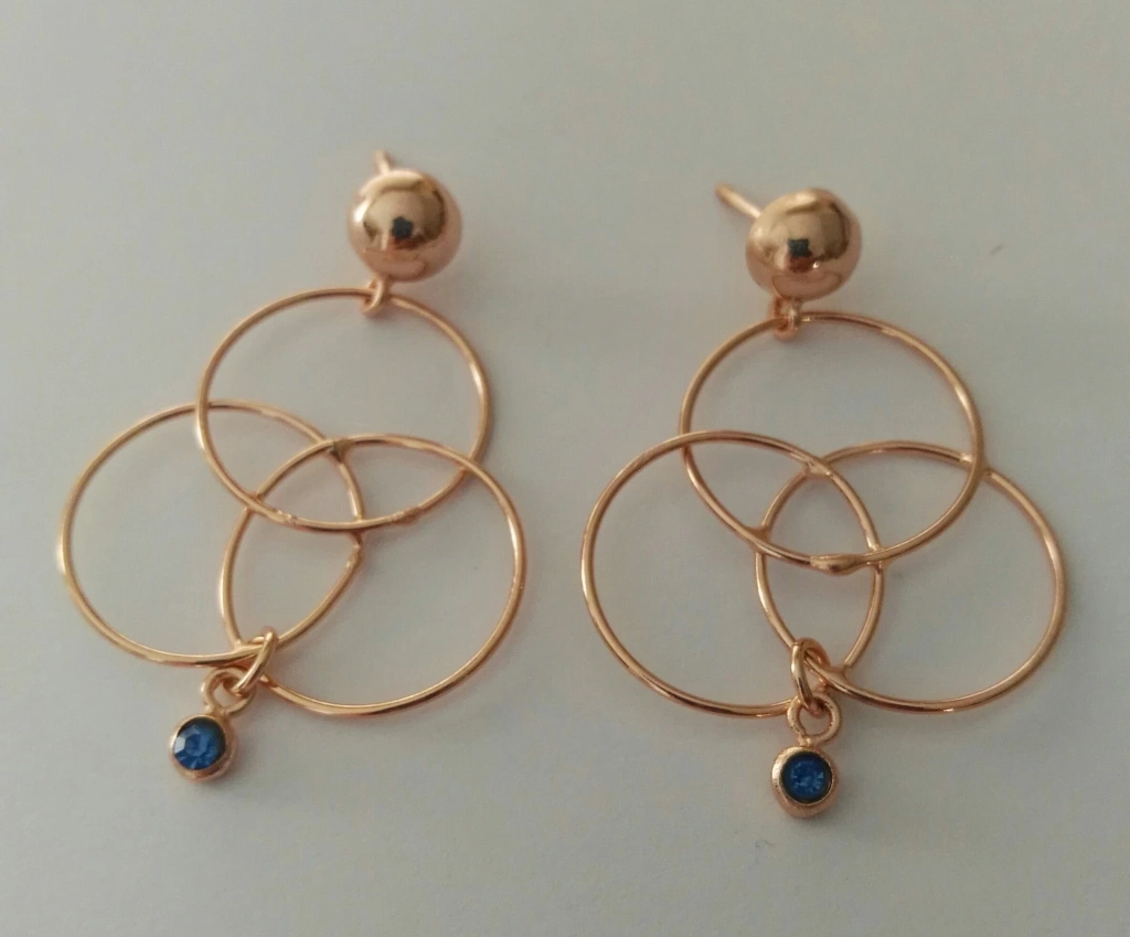 Pendientes de tres circulos , de metal con baño de oro rosa, con piedras de swarovski azul zafiro.